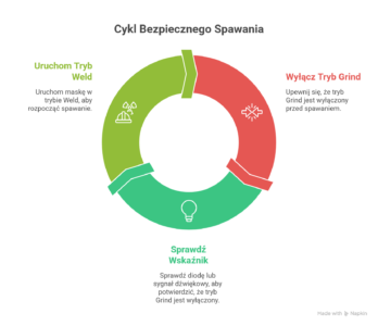 Najczęstszy błąd to rozpoczęcie spawania w aktywnym trybie Grind – co kończy się nagłym oślepieniem i silnym dyskomfortem oczu. Dlatego: